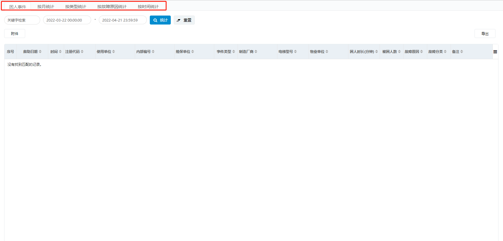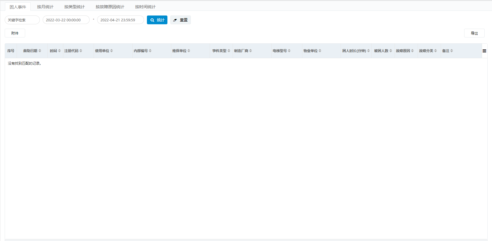 困人统计的主要功能是统计困人故障数据分类汇总。