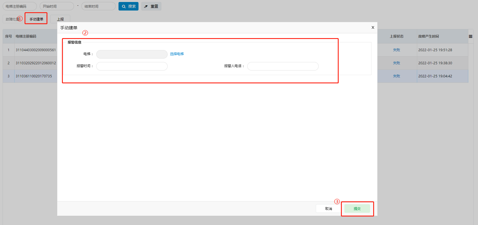 1. 单击左上方“手工建单”按钮,填写相关信息,单击“提交”按钮,完成手工建单。