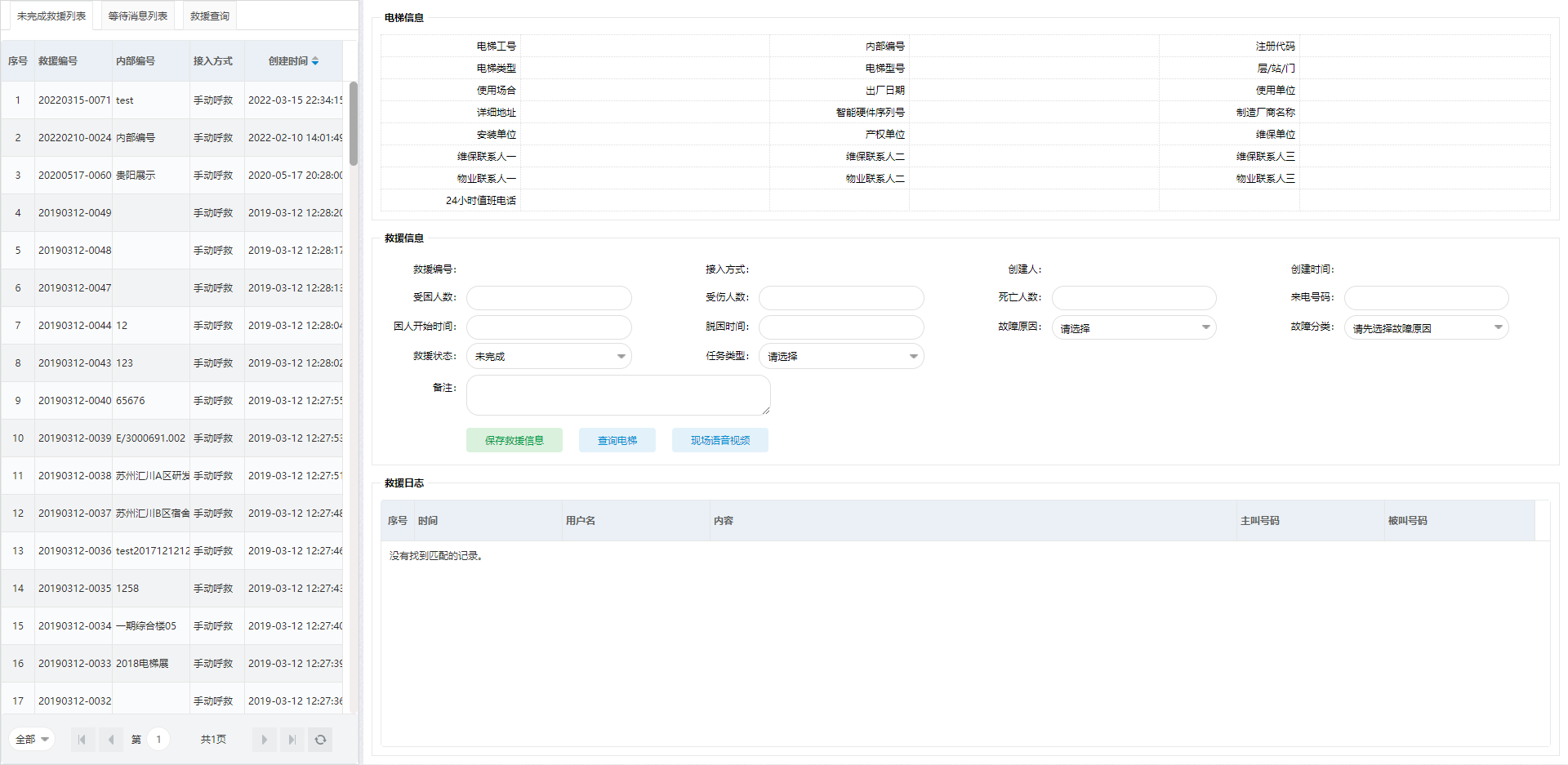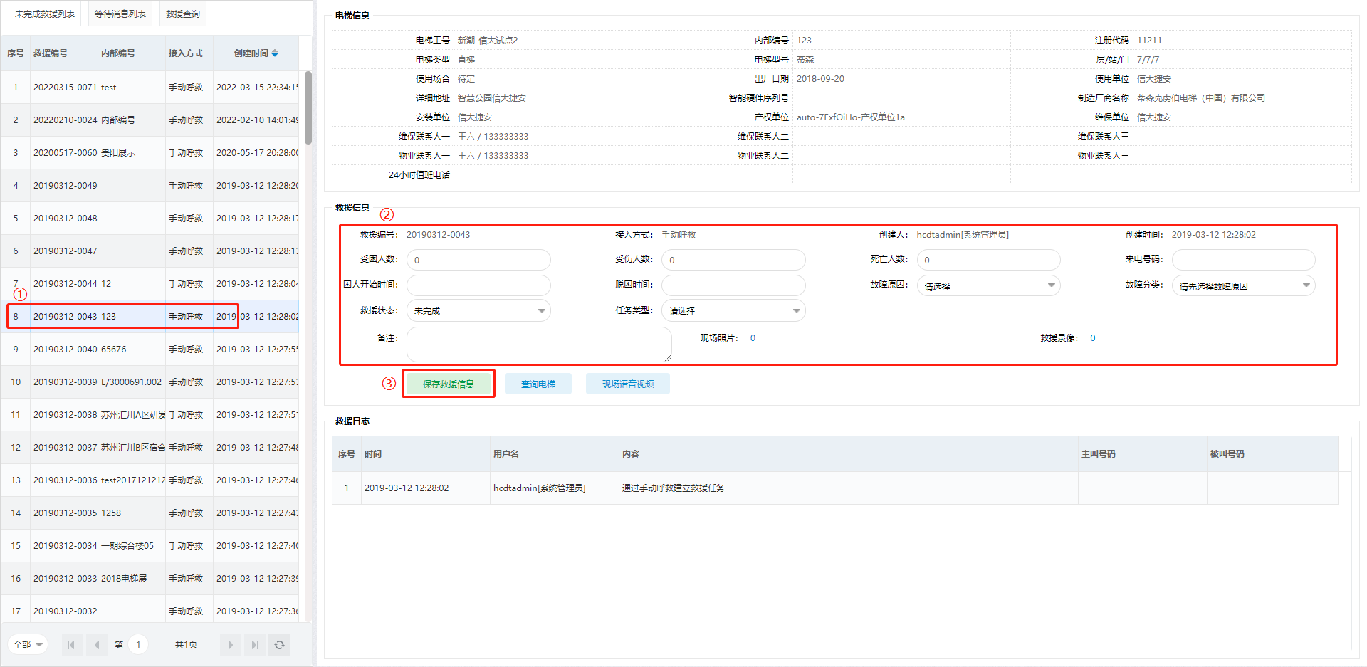 2. 选择对应的电梯,输入救援信息,单击“保存救援信息”按钮,完成救援任务的建立。