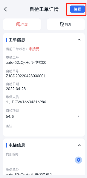 当工单发送给维保人员后,维保人员在手机上看到一条“未接受”状态的工单,可以进行“接受”操作。