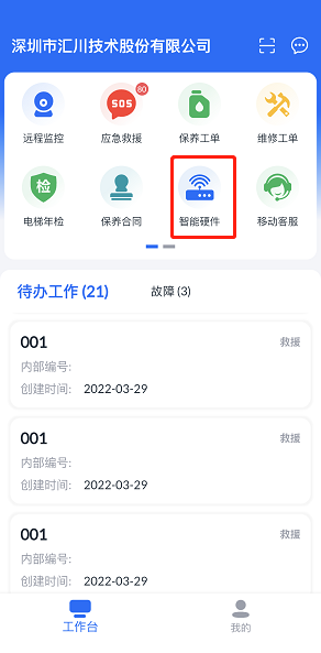 1. 登录电梯物联网APP,选择“工作台>智能硬件”,进入“智能硬件”页面。