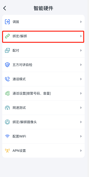 1. 选择“绑定/解绑”,进入“设备绑定、解绑”页面。
