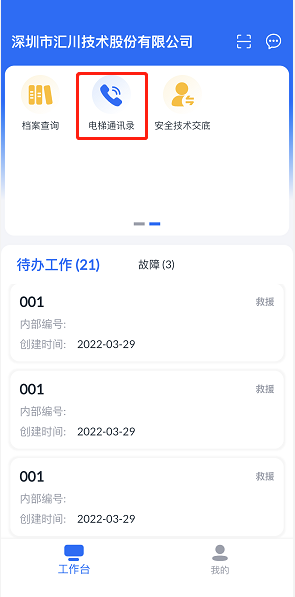 1. 登录电梯物联网APP,选择“工作台>电梯通讯录”,进入“档案查询”页面。