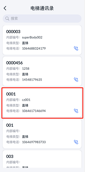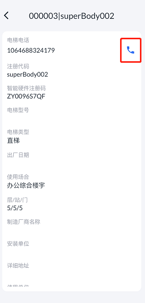 1. 选择对应的电梯,进入电梯详情,单击右上角“电话”图标,拨打电梯电话。