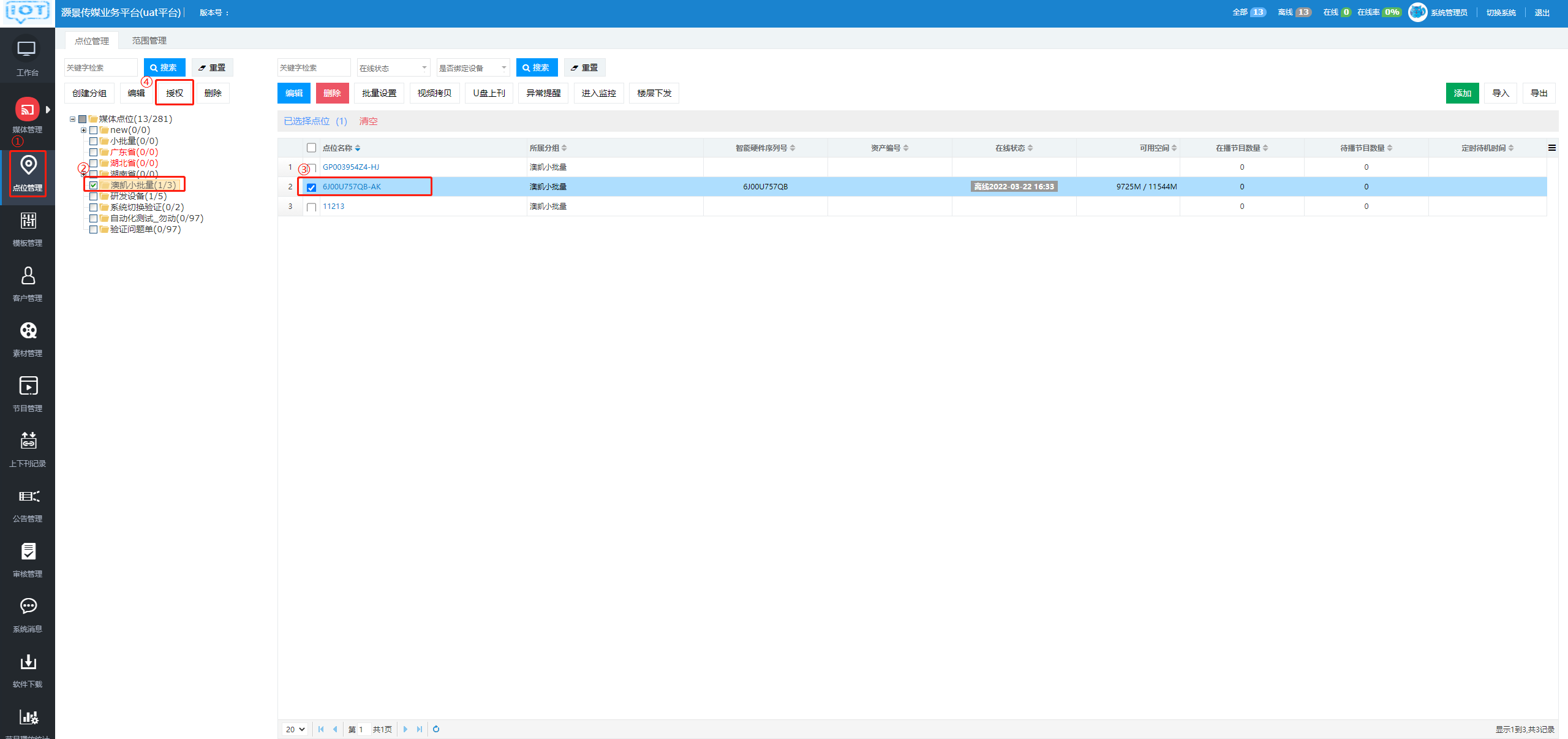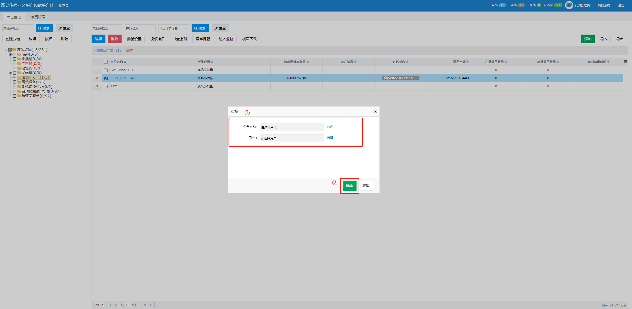 1. 登录媒体管理系统平台,选择“媒体管理>点位管理”,进入“点位管理”页面,选择对应的点位后,单击左上角“授权”按钮。