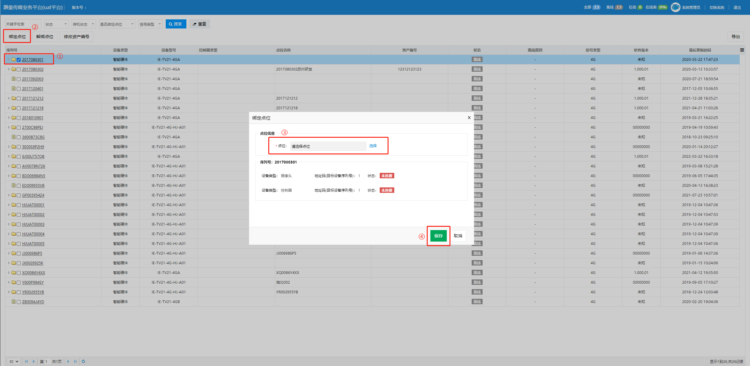 * 登录媒体管理系统平台,选择“档案管理>智能硬件管理”,进入“智能硬件管理”页面,选择对应智能硬件,单击左上角“绑定点位”按钮,弹出“绑定点位”对话框,选择对应点位后,单击“保存”按钮,完成保存。