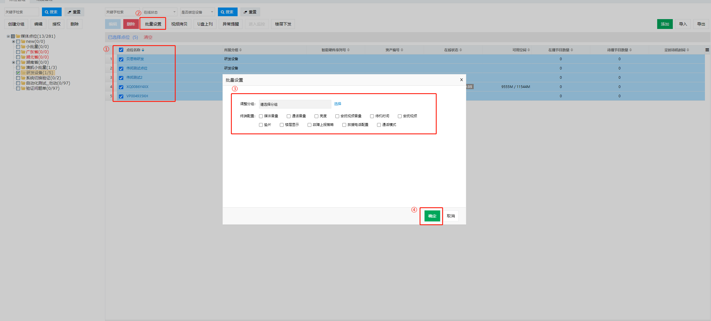 1. 登录媒体管理系统平台,选择“媒体管理>点位管理”,进入“点位管理”页面,勾选多台点位或者勾选分组(自动勾选分组下所有点位),单击“批量设置”按钮,完成相关配置后,单击下方“确定”按钮,完成批量配置。