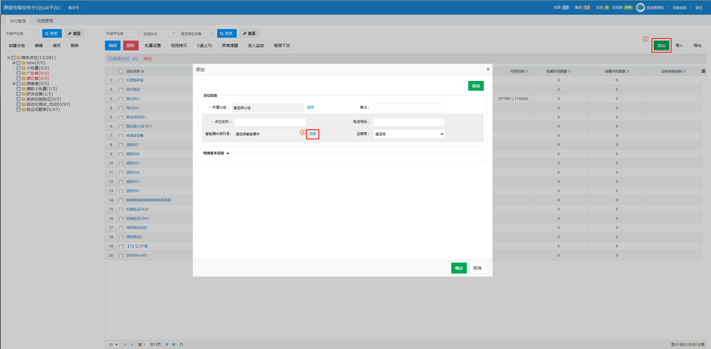 * 登录媒体管理系统平台,选择“媒体管理>点位管理”,进入“点位管理”页面,单击右上角“添加”按钮,选择对应智能硬件进行绑定。