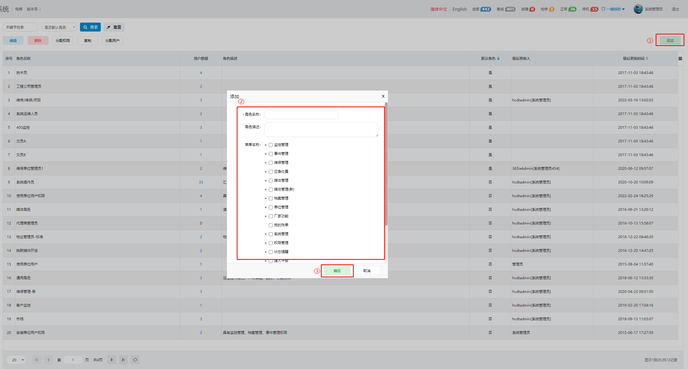 1. 单击右上角“添加”按钮,在对话框中输入角色名称、角色描述,勾选维保人员角色所需要的权限,单击“确定”按钮”,完成维保人员角色创建。