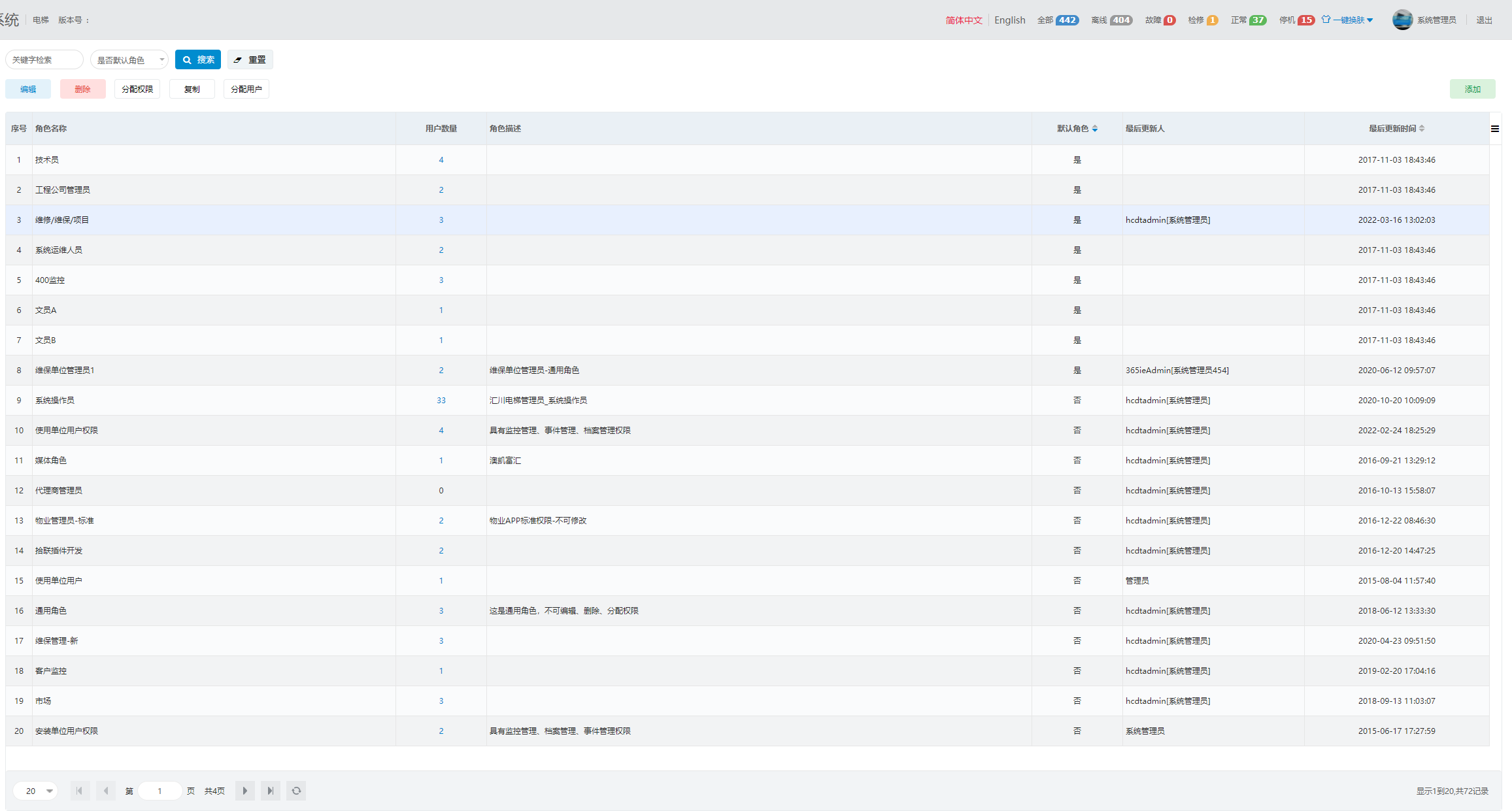 1. 登录电梯物联网平台,选择“权限管理>角色管理”,进入“角色管理”页面。
