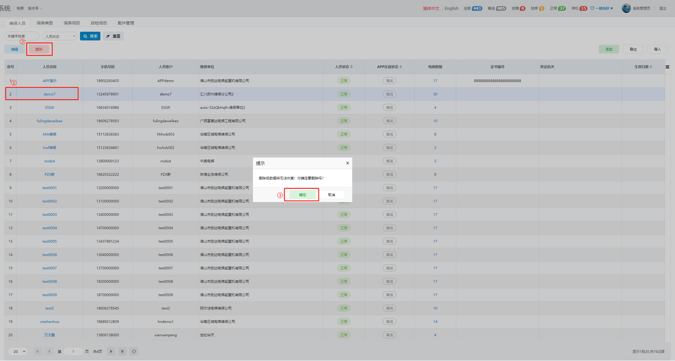 当不需要某个维保人员时,可以删除维保人员。