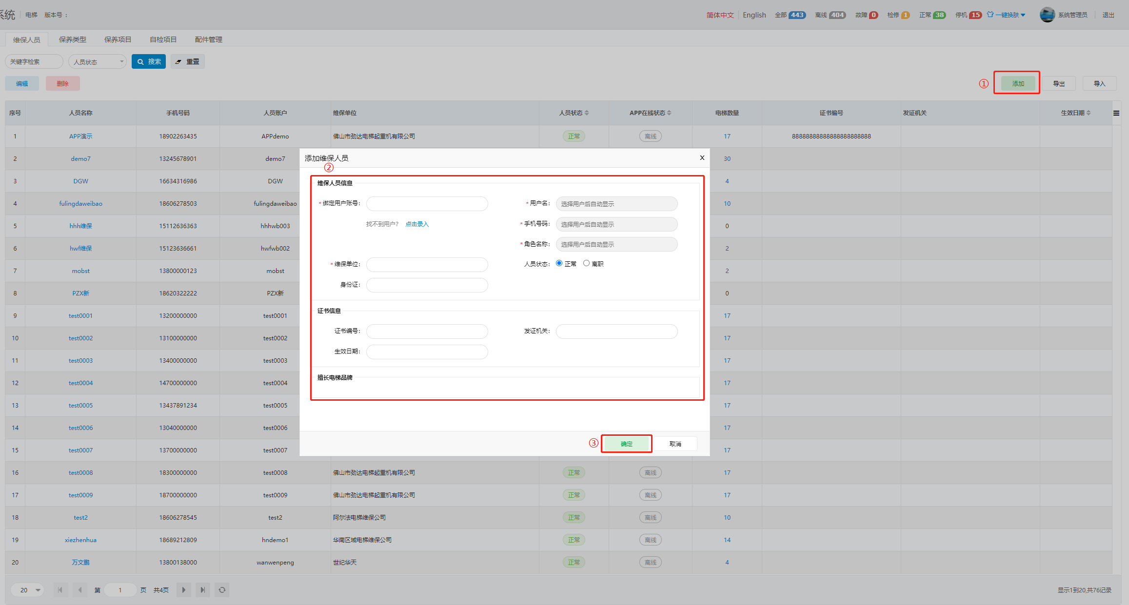 1. 单击右上角“添加”按钮,输入相关维保人员信息,单击确定按钮,完成维保人员的添加。