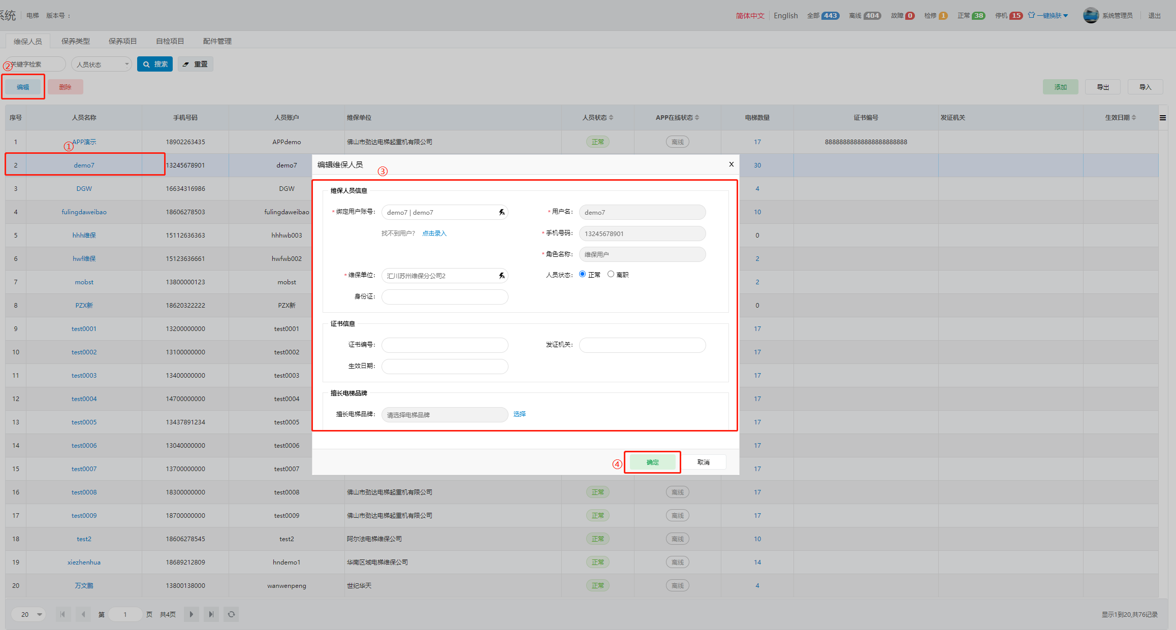 1. 选中一条维保人员记录,单击左上角“编辑”按钮,编辑完维保人员的信息后,单击“确定”按钮,完成编辑。