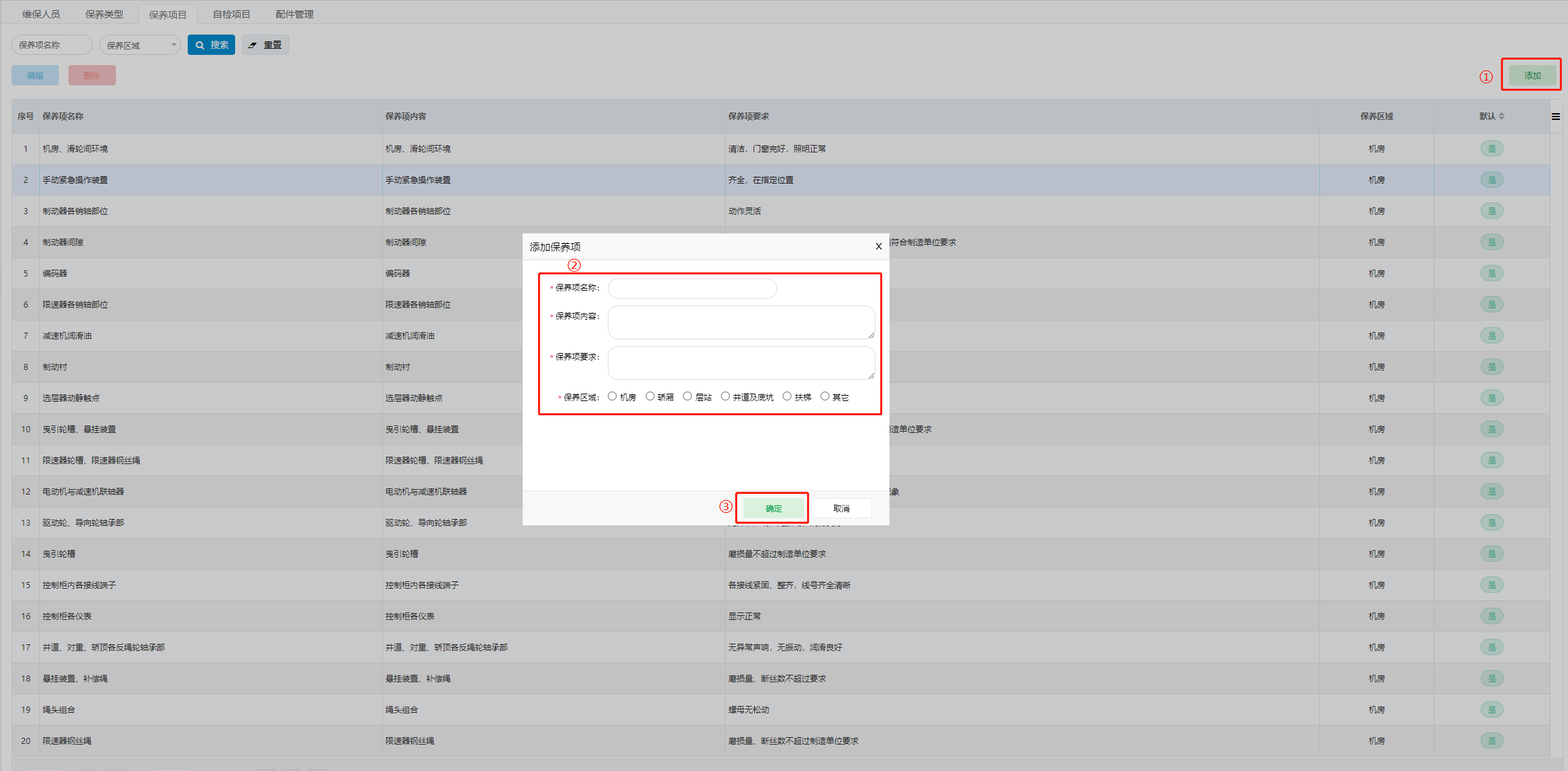 1. 选择“保养项目”页签,单击右上角“添加”按钮,输入相关信息,单击“确定”按钮,完成保养项目添加。