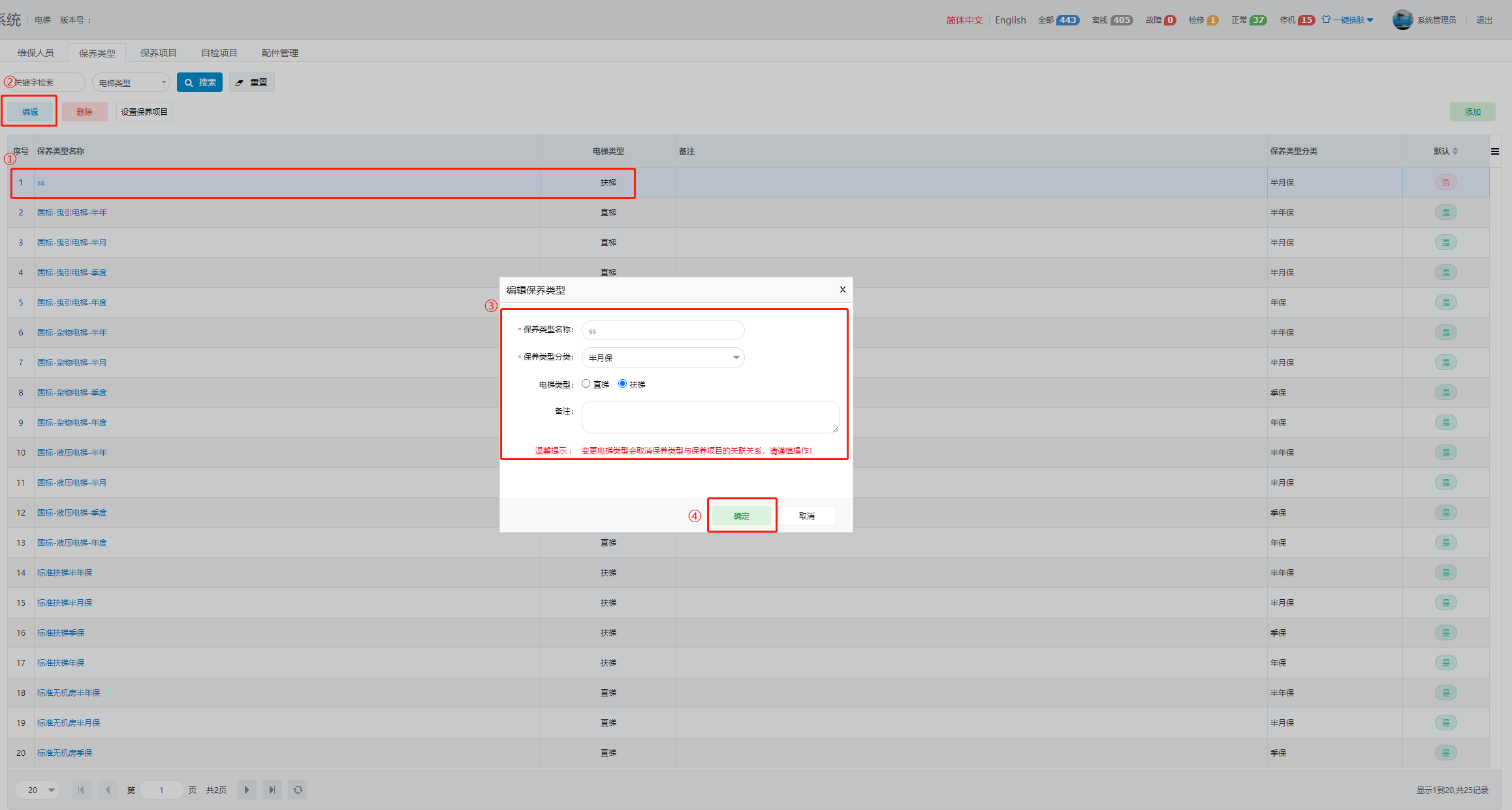 1. 选择“保养类型”页签,选择一条保养类型,单击左上角“编辑”按钮,输入相关信息,单击“确定”按钮,完成保养类型编辑。