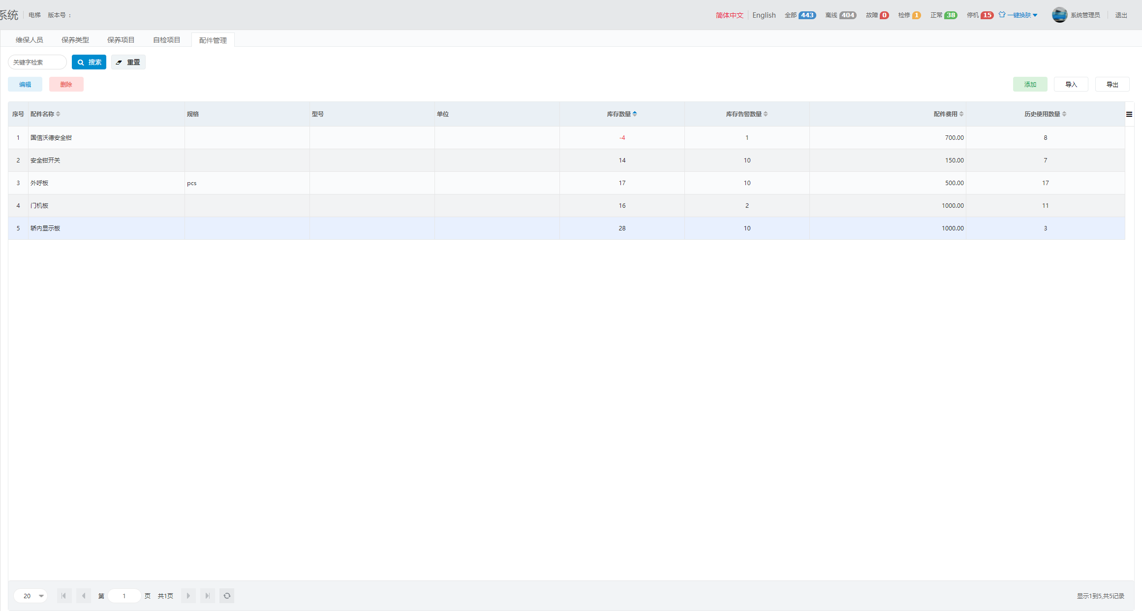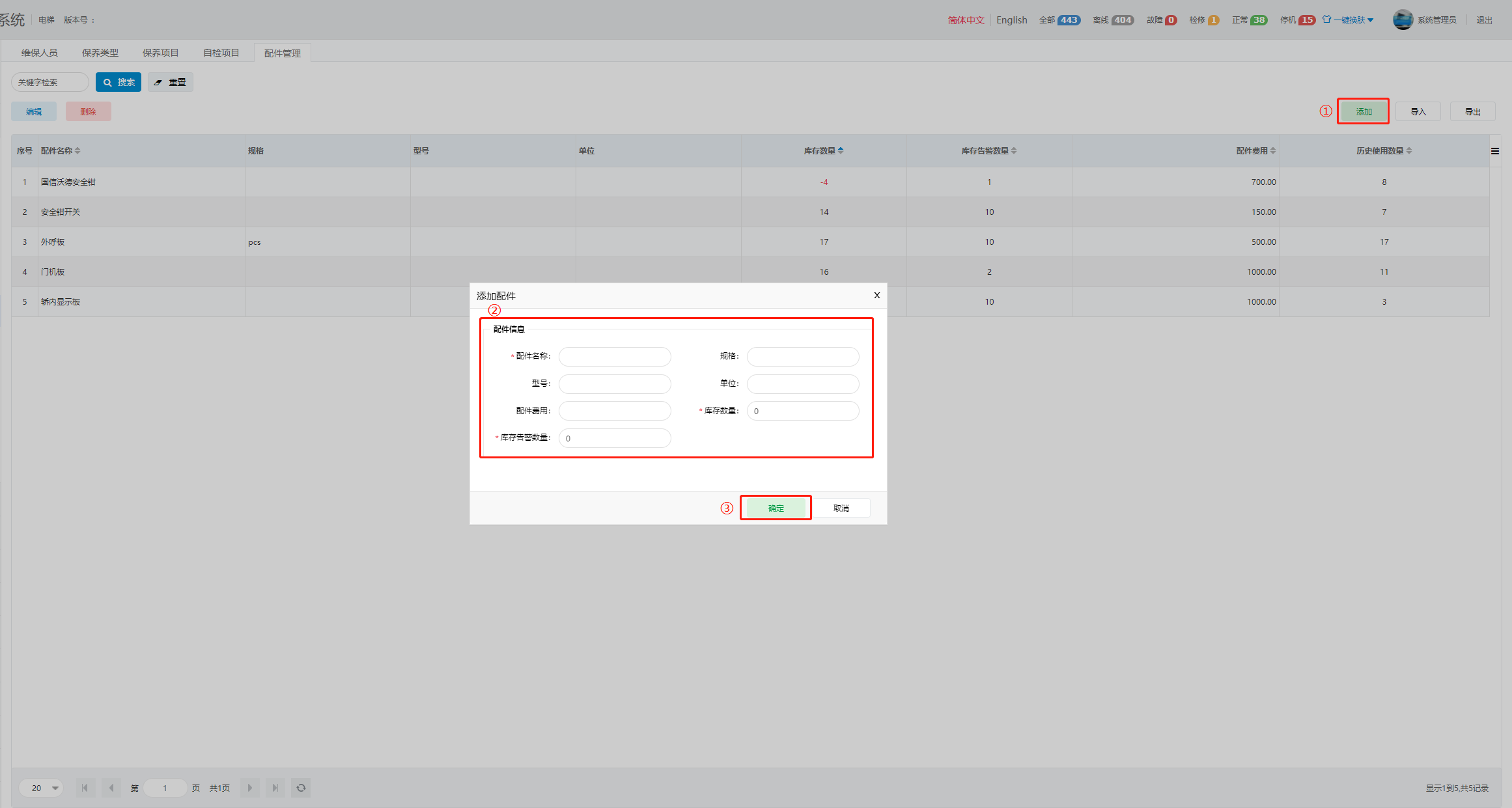 1. 选择“配件管理”页签,单击右上角“添加”按钮,输入相关信息,单击“确定”按钮,完成配件添加。