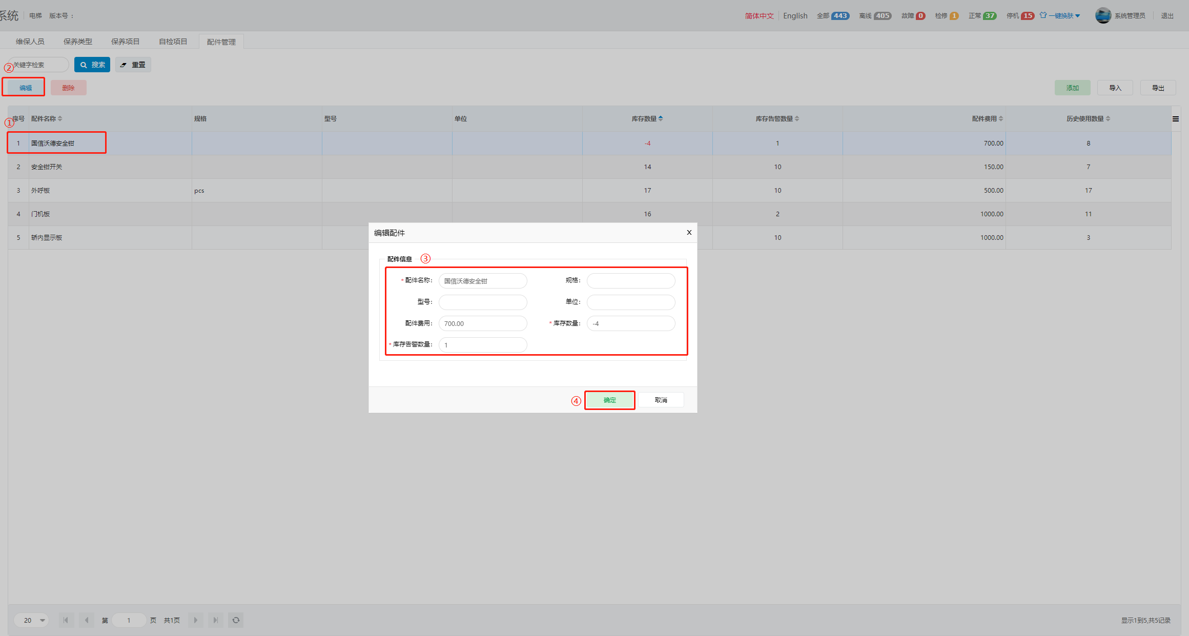 1. 选择“配件管理”页签,选择一条配件记录,单击左上角“编辑”按钮,输入相关信息后,单击“确定”按钮,完成配件编辑。