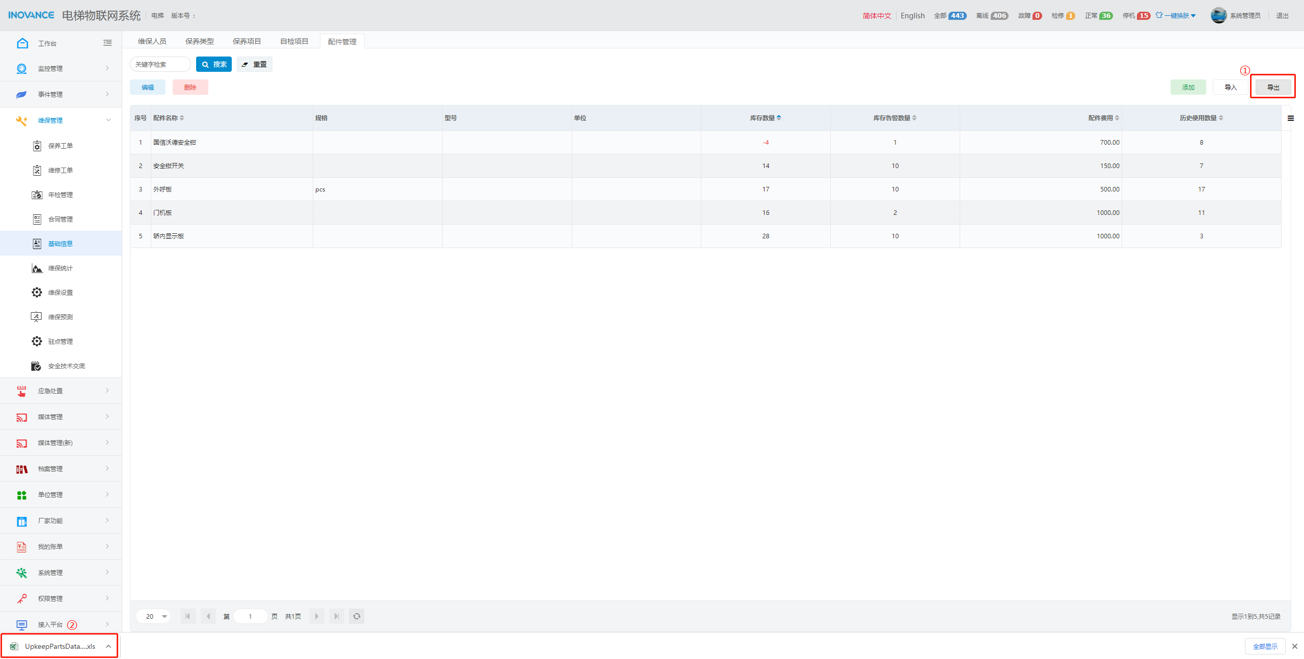 1. 选择“配件管理”页签,单击右上角“导出”按钮,下载的文件名为“UpkeepPartsData.xls”,单击打开,完成配件导出。