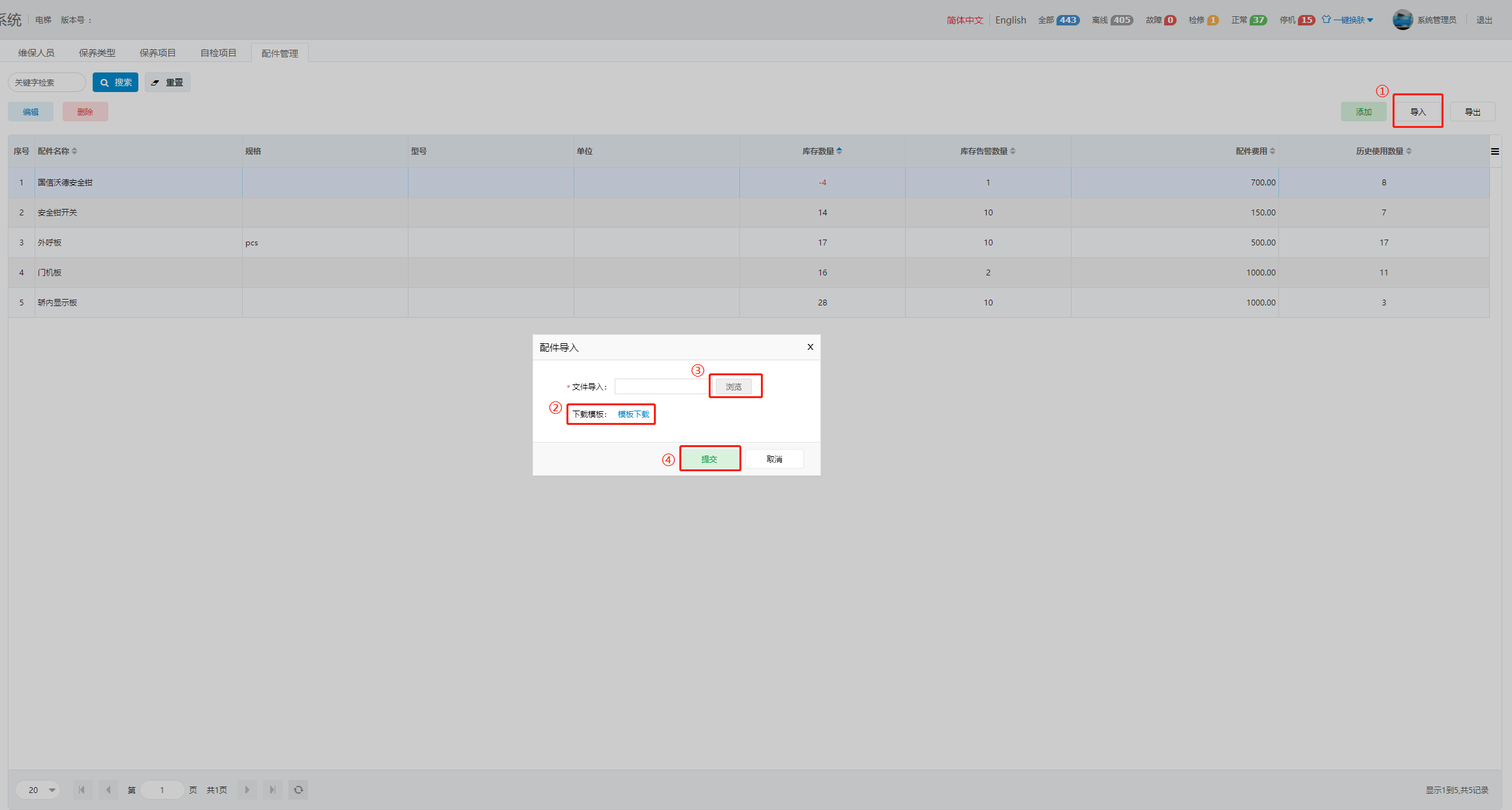 1. 选择“配件管理”页签,单击右上角“导入”按钮,选择“模板下载”,保存模板Excel文件,在文件中输入相关信息后,单击浏览导入,单击“提交”按钮,完成配件导入。