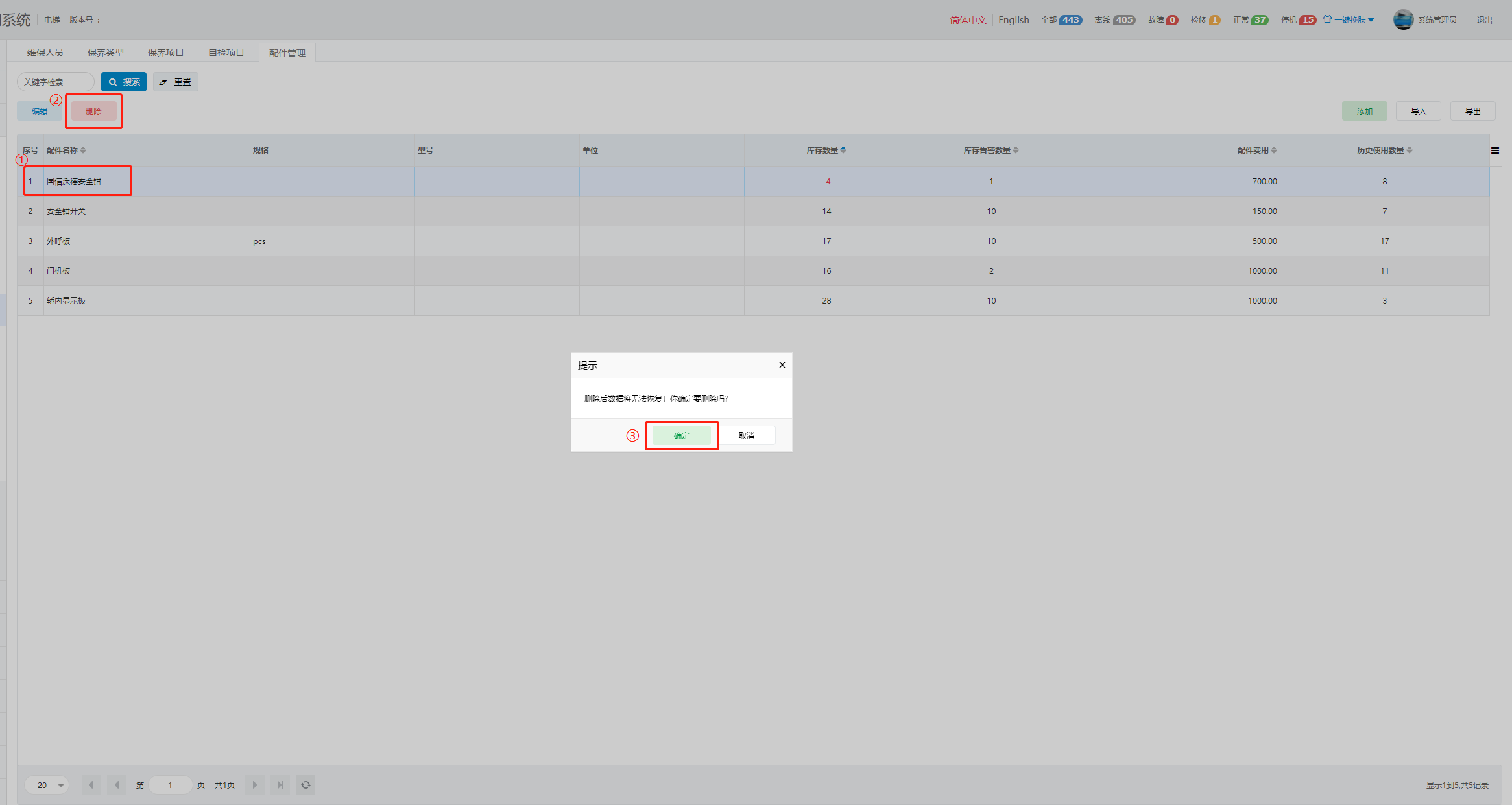 1. 选择“配件管理”页签,选择一条配件记录,单击左上角“删除”按钮,单击“确定”按钮,完成配件删除。