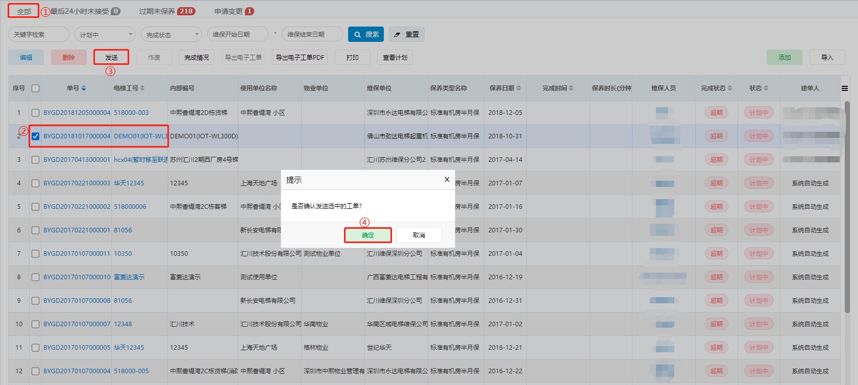 3. 单击提示框中的“确定”,即可完成保养工单的手动发送。