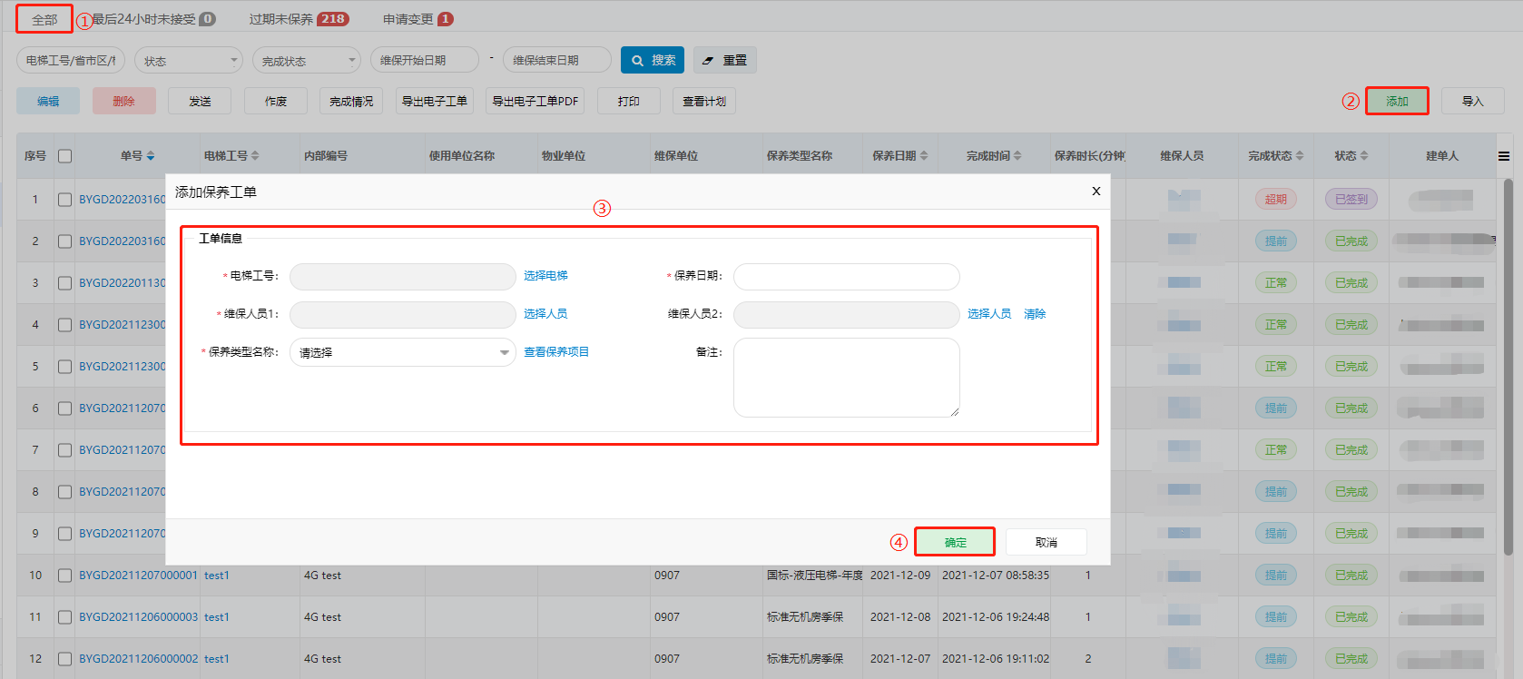 2. 在左上方选择“全部”页签,然后单击右上角的“添加”,进入“添加保养工单”页面。