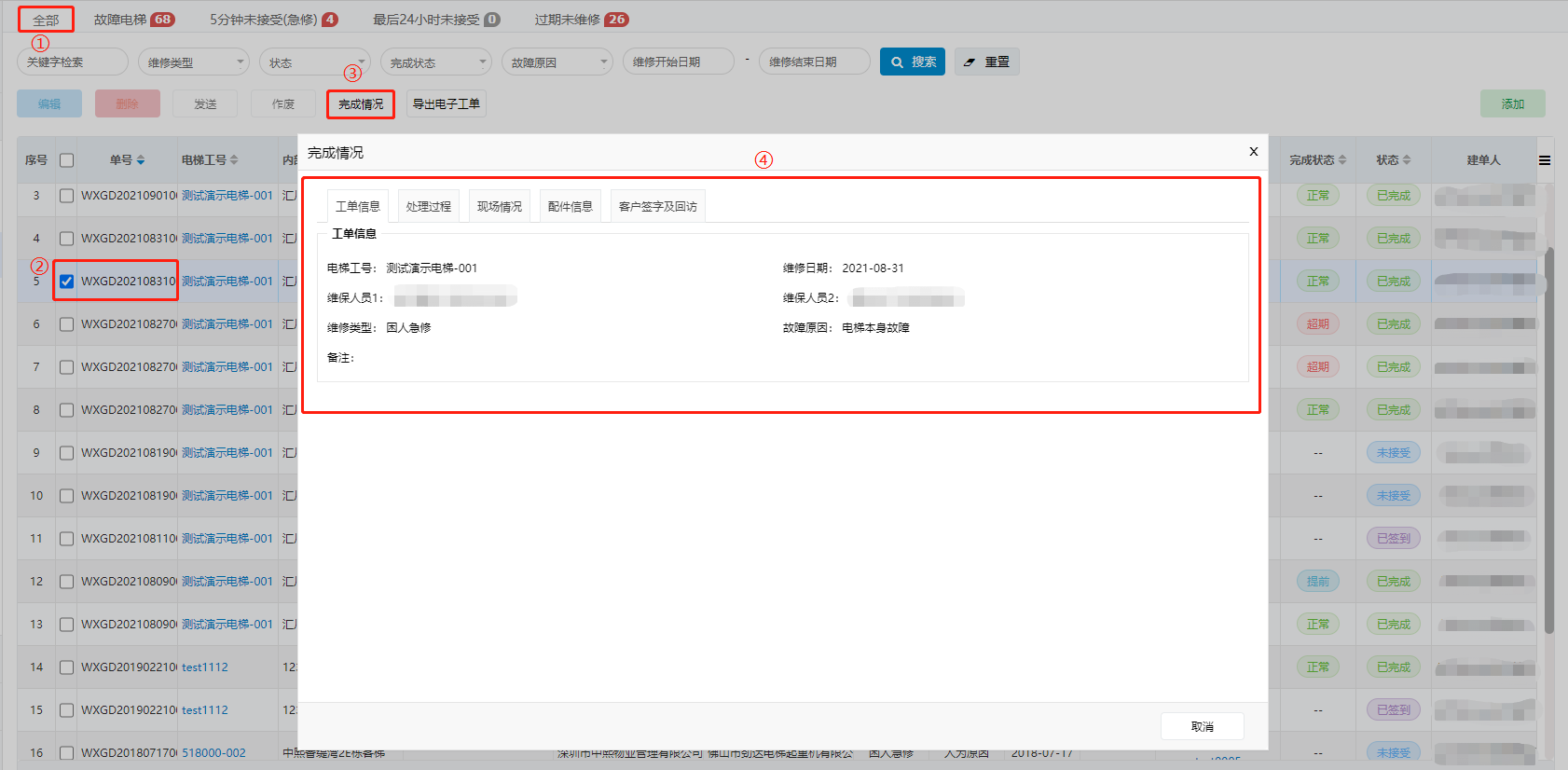 2. 在左上方选择“全部”页签,勾选想要查看的维修工单,单击左上角的“完成情况”。