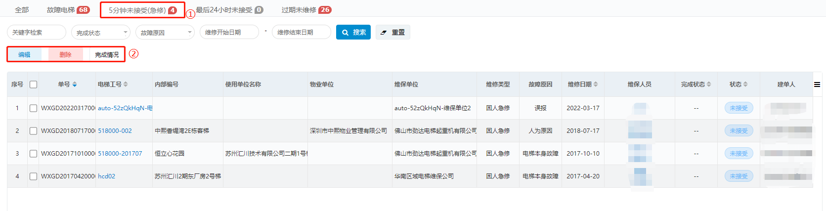 如果某条工单为“困人急修”类型,且当前时间减去维修工单的发送时间大于5分钟,那么此条工单会出现在维修工单的“5分钟未接受(急修)”页签里,表示困人急修单的维保人员已经超过5分钟没有接受工单。可看到顶部有闪灯数字提示。列表中只有“未接受”的“困人急修”工单,选中某条工单可以进行编辑、删除和查看完成情况操作。