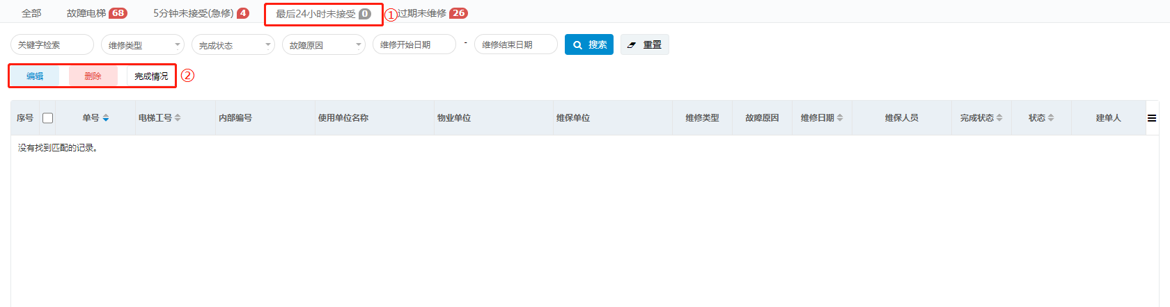 如果某条工单的维修日期减去当前日期的结果小于24小时,那么此条工单会出现在维修工单的“24小时未接受”页签里。可看到顶部有闪灯数字提示。列表中只有“未接受”的工单,选中某条工单可以进行编辑、删除和查看完成情况操作。
