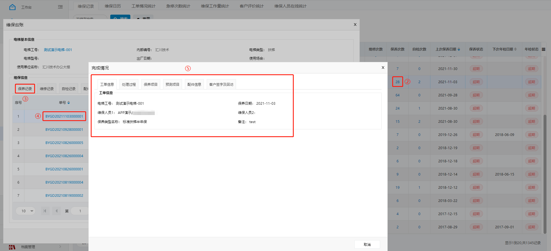 4. 单击对应电梯“维保次数”列中的数字,即可打开“维保台账”页面,在维保信息下选择“保养记录”页签,单击对应的维保单号,可查看对应维保单的完成情况。