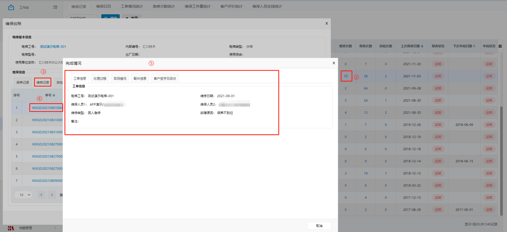 3. 单击对应电梯的“维修次数”列中的数字,即可打开“维保台账”页面,在维保信息下选择“维修记录”页签,单击对应的维修单号,可查看对应维修单的完成情况。