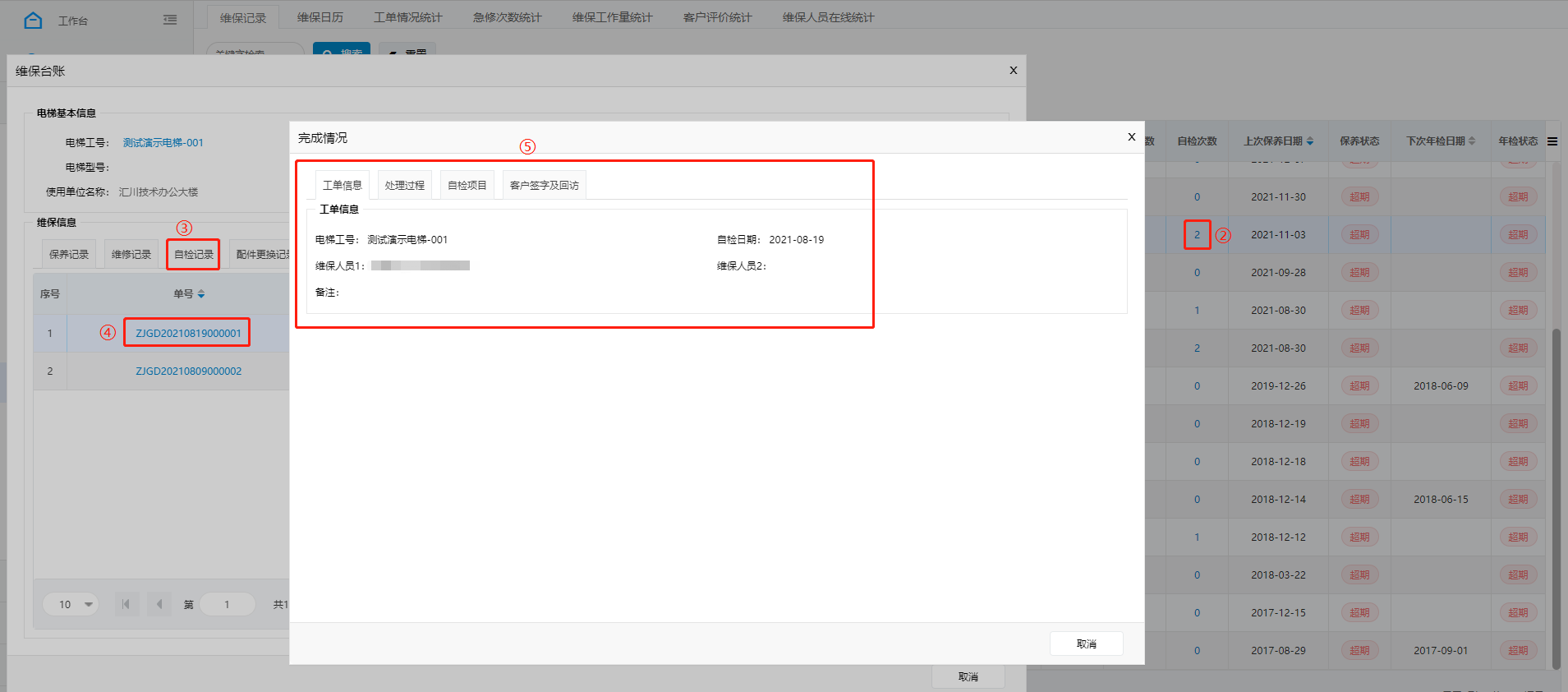 5. 单击对应电梯“自检次数”列中的数字,即可打开“维保台账”页面,在维保信息下选择“自检记录”页签,单击对应的自检单号,可查看对应自检单的完成情况。
