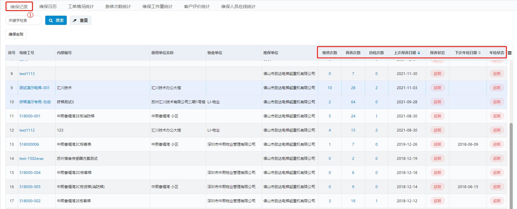 维保记录用于统计维保单位下的所有电梯的维保情况,包括已完成的维修次数、已完成的保养次数、上次保养日期、保养状态,还可以查看每部电梯的维保台账。