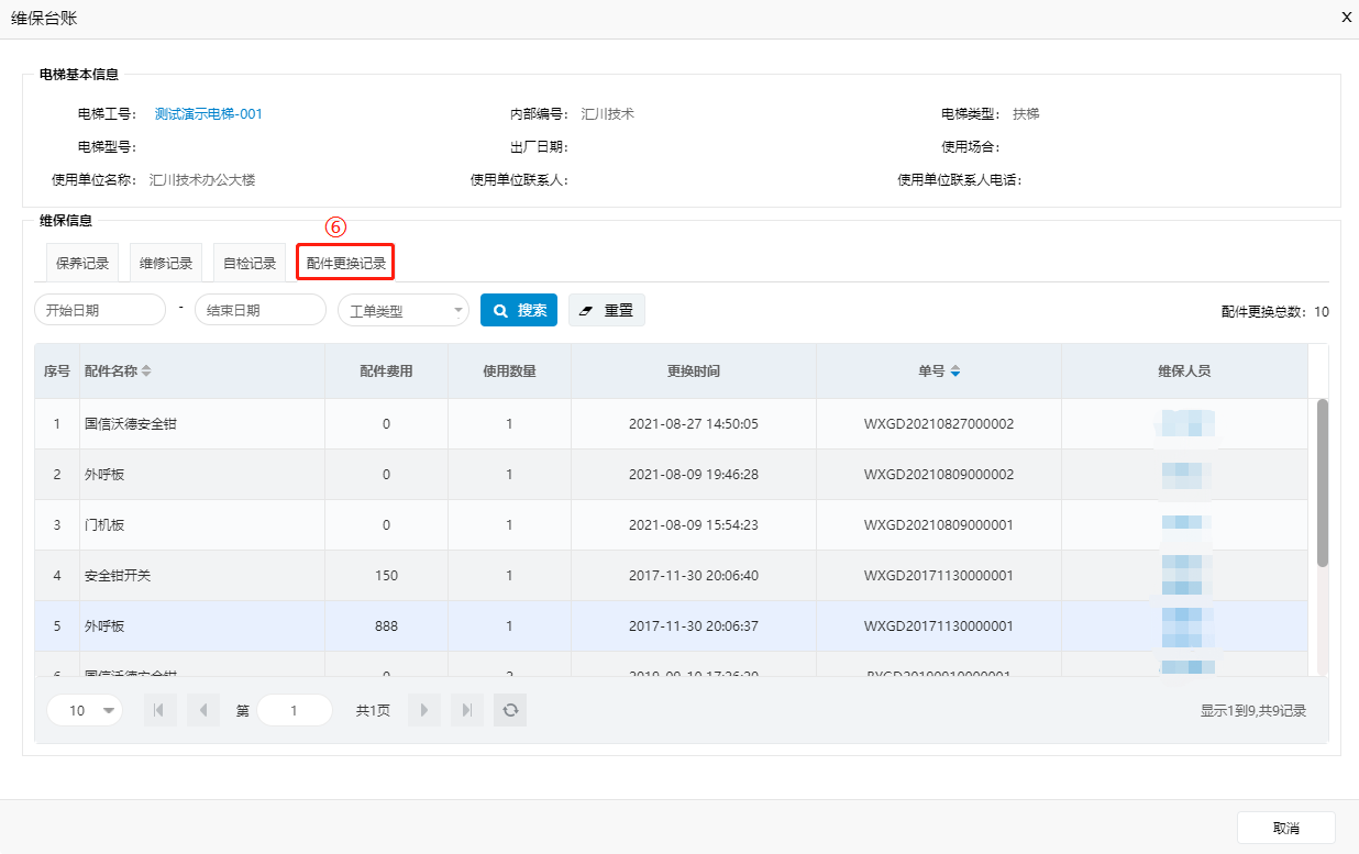 6. 在“维保台账”页面的维保信息下还支持选择“配件更换记录”页签,可查看对应电梯已经更换的所有配件信息(统计的是该电梯所有已完成“计划维修”工单中的所有配件)。