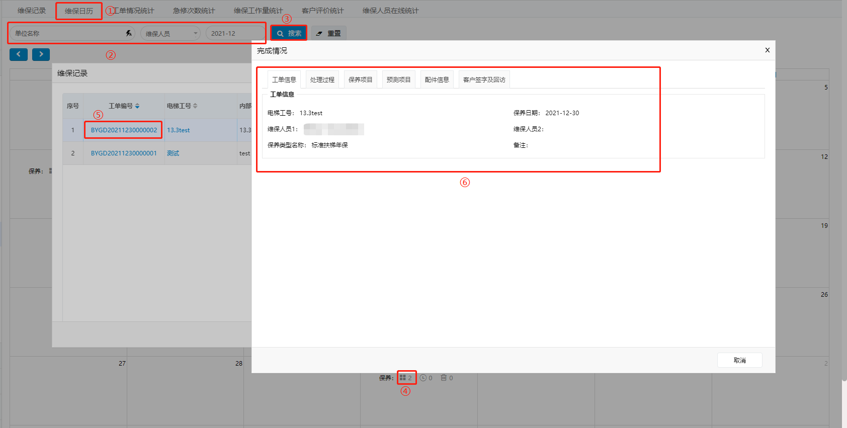 2. 在上方选择“维保记录”页签,在左上方的输入对应的维保单位、维保人员和年月,单击“搜索”,即可查看对应的维保日历。
