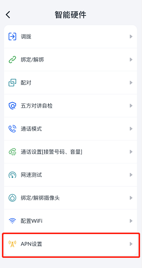 1. 登录电梯智联APP后,选择“工作台>智能硬件”,单击“APN 设置”。(若无APN设置菜单,请联系客服开通此菜单权限)。
