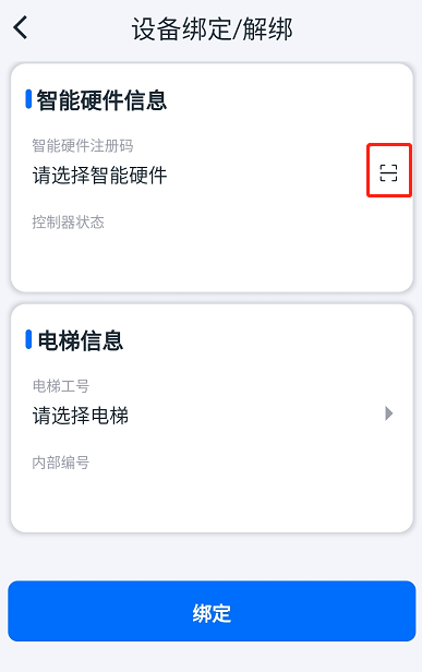 登录手机APP,选择“智能硬件>绑定/解绑”,进入“设备绑定/解绑”页面,单击图标,即可扫描IOT设备上的二维码,在下方的电梯信息选择要绑定的电梯,即可完成绑定。