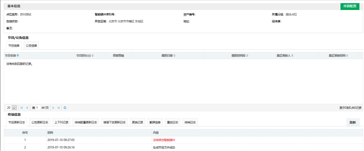 进入到点位详情页面,可查看基本信息、正在播放的节目、单台配置、查看日志(更新进度、手动截图、重启)等。
