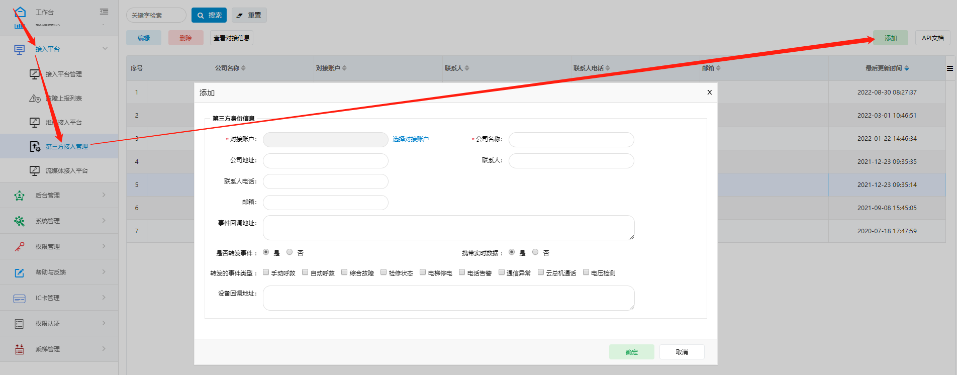 进入工作台,单击“接入平台 > 第三方接入管理”,单击“添加”按钮,生成客户对接信息。