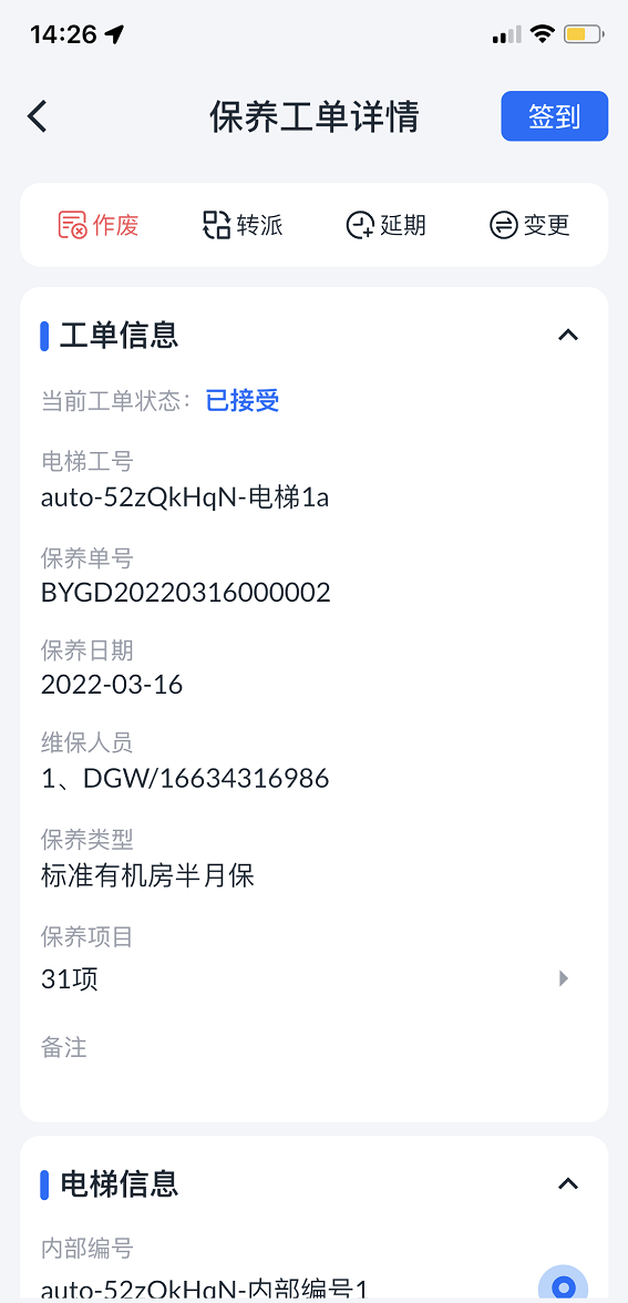 当维保人员接受工单后,到达现场时需要对工单进行签到操作,签到时手机必须开启网络和GPS权限,系统会记录签到时手机与电梯的距离,签到之后维保人员才可以在APP上进行维保作业记录。