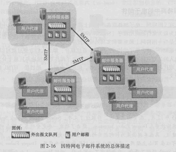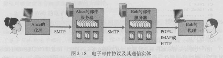 * 简单邮件传输协议(Simple Mail Transfer Protocol,SMTP):因特网主要的应用层协议,使用TCP可靠数据传输