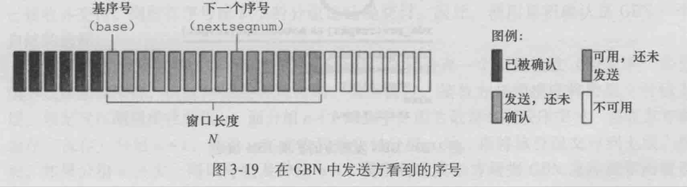回退N步(Go-Back-N,GBN):允许发送多个分组,但未确认分组数不能超过N。N也称窗口长度,GBN也是一种滑动窗口协议(Sliding-Window Protocol)。