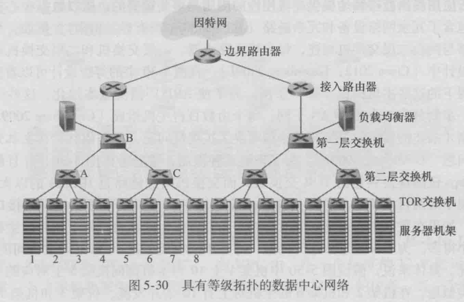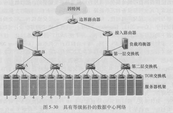 数据中心通常用路由器和交换机等级结构(Hierarchy of Router and Switch),可以解决体系扩展性问题。
