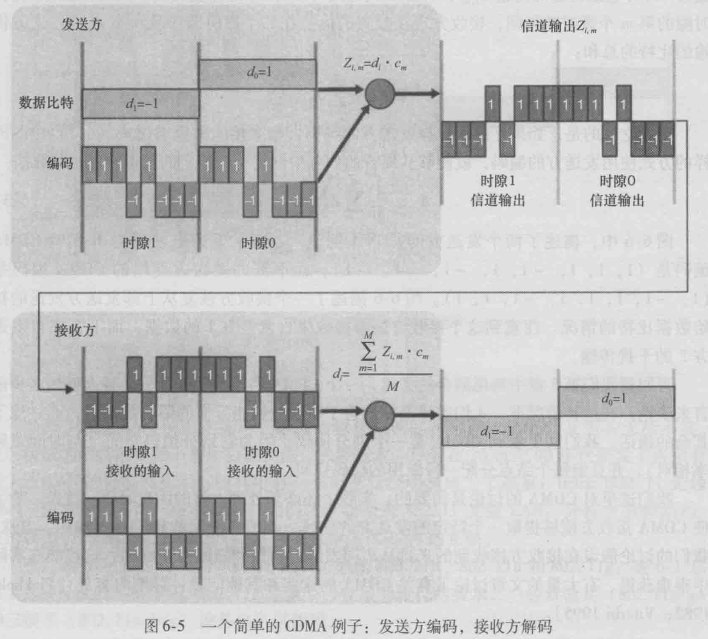 要发送的接一个比特通过乘以一个信号(编码),信号的变化速率(码片速率,Chapping Rate)比初始比特序列的变化速率快得多。类似于鸡尾酒会,人们用不同的语言沟通。