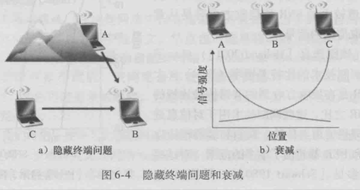 * 隐藏终端问题(Hidden Terminal Problem):多个发送方由于环境的物理阻挡而不能检测碰撞。