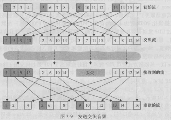* 交织(Interleaving):发送方在传输之前对音频单元重新排序,使得最初相邻的单元在传输流中以一定距离分开,以减少丢包的影响。