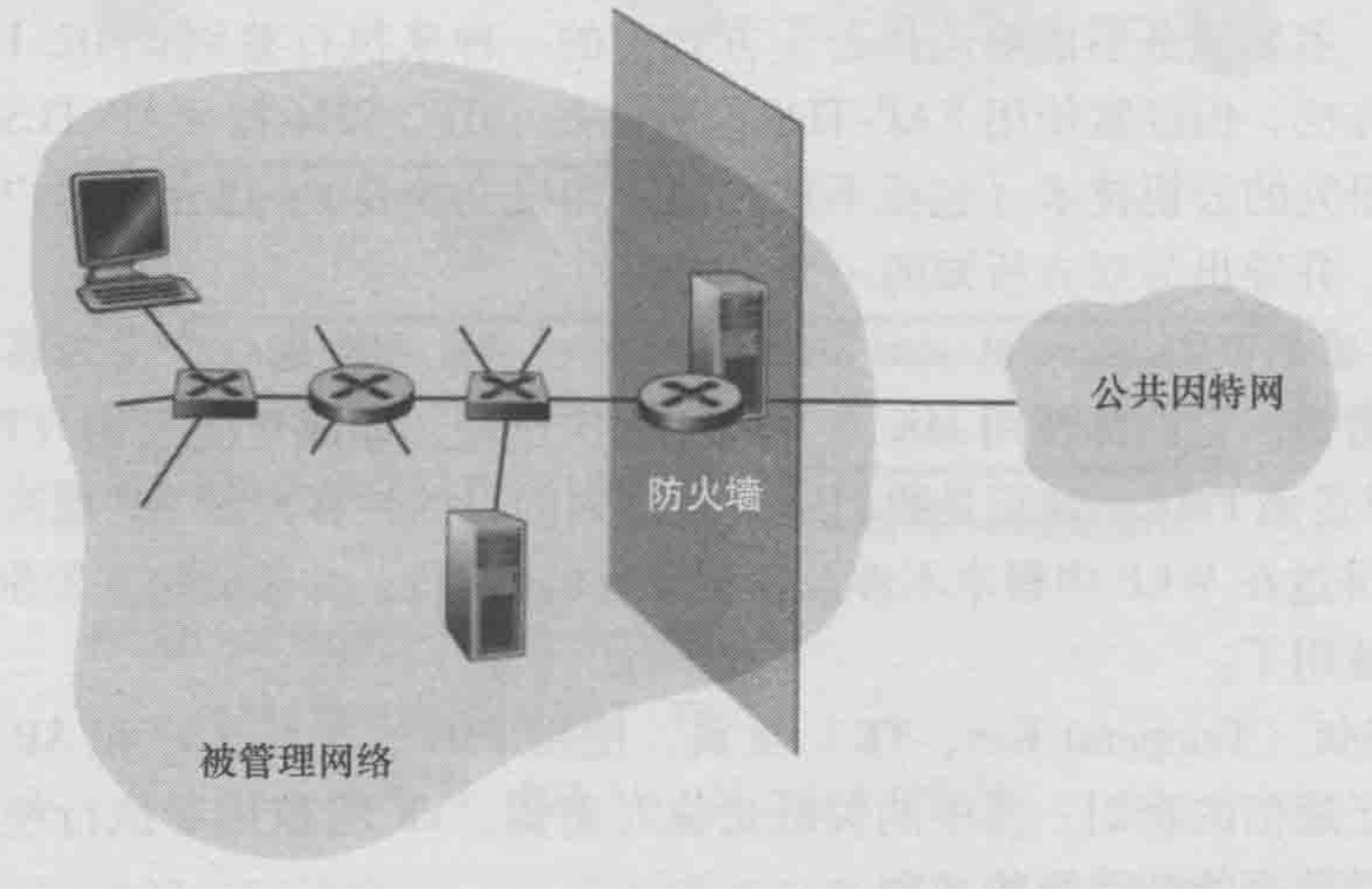 防火墙(Firewall):一个硬件和软件的结合体,它将一个机构的内部网络与整个因特网隔离开,允许一些数据分组通过,而阻止另一些。