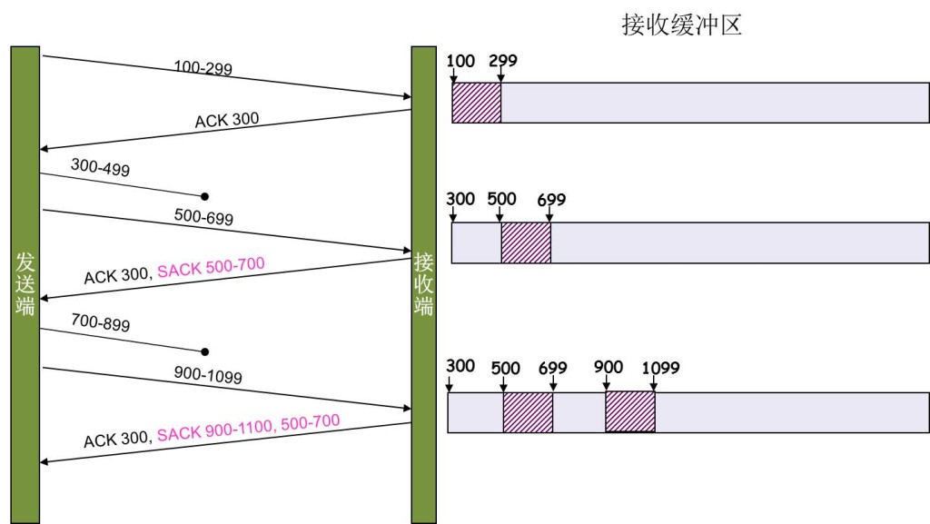 **SACK 方法**:在TCP头里加一个SACK的东西,ACK还是Fast Retransmit的ACK,SACK则是汇报收到的数据碎版。