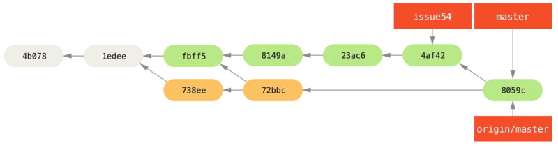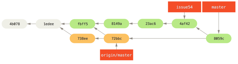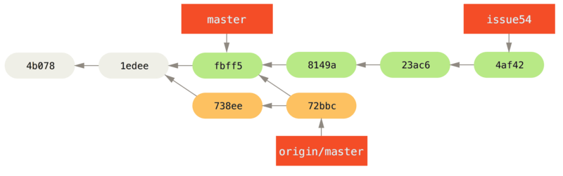 `issue54..origin/master`语法是一个日志过滤器,要求 Git 只显示所有在后面分支不在前面分支的提交的列表。
