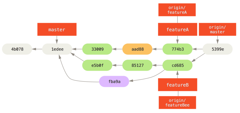 最后,分支 `featureA` 和 `featureB` 被统一合并到 `master` 分支上: